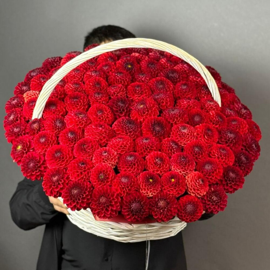 На фото композиция из 101 красной георгины в корзине. В составе: георгина 101 шт, оазис флористический 7 шт, корзина (xl) 1 шт, атласная лента 2 шт, . Все цветы свежие и ароматные, букет красиво оформлен и отлично подходит для подарка. Доступна доставка цветов или самовывоз.