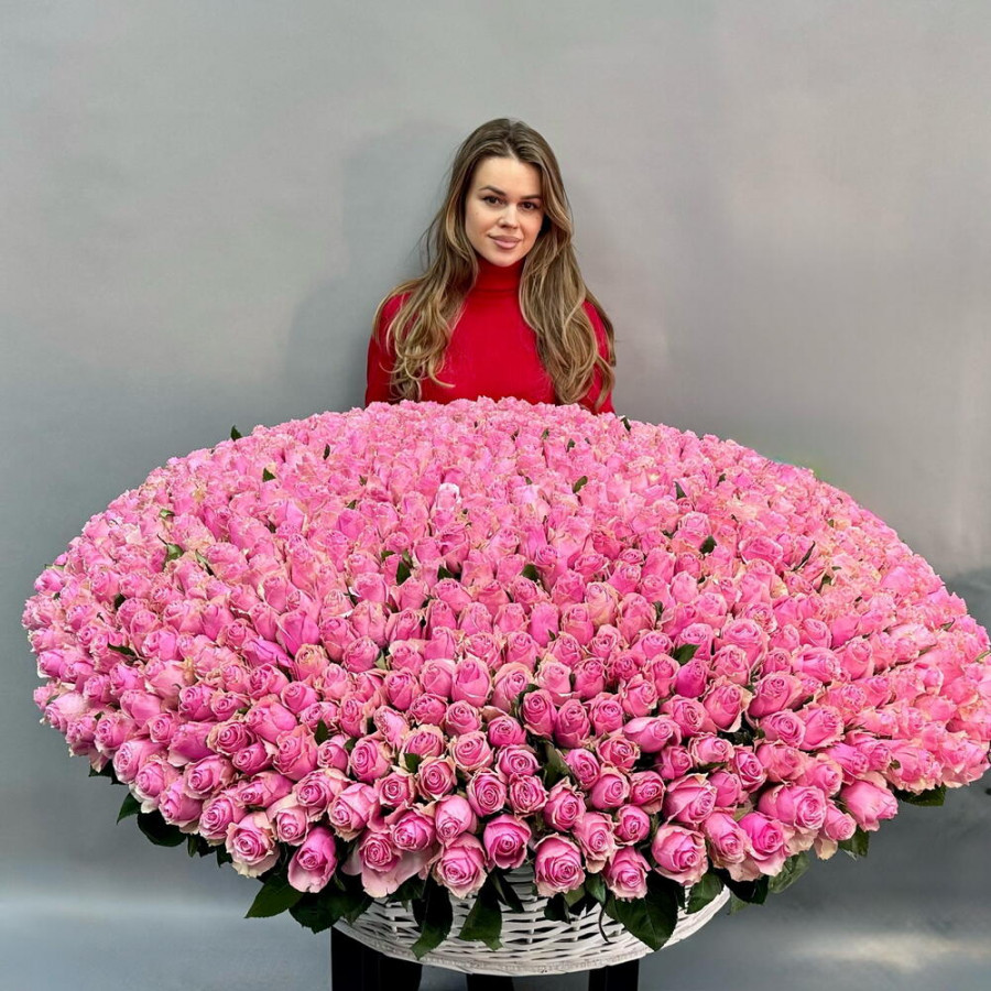 На фото букет из 501 розовой розы «очарование». В составе: роза 501 шт, корзина (xl) 1 шт, оазис флористический 4 шт, . Все цветы свежие и ароматные, букет красиво оформлен и отлично подходит для подарка. Доступна доставка цветов или самовывоз.